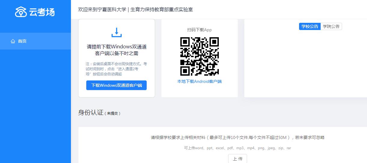 5.登录云考场后,参考图1,请提前下载Windows双通道客户端以备在线平台故障时启动桌面版云考场(注:安装后桌面不会出现快捷方式。考试时间到时,点击“进入通道2考场”按钮后会自动启动),扫描二维码安装第二机位手机App。