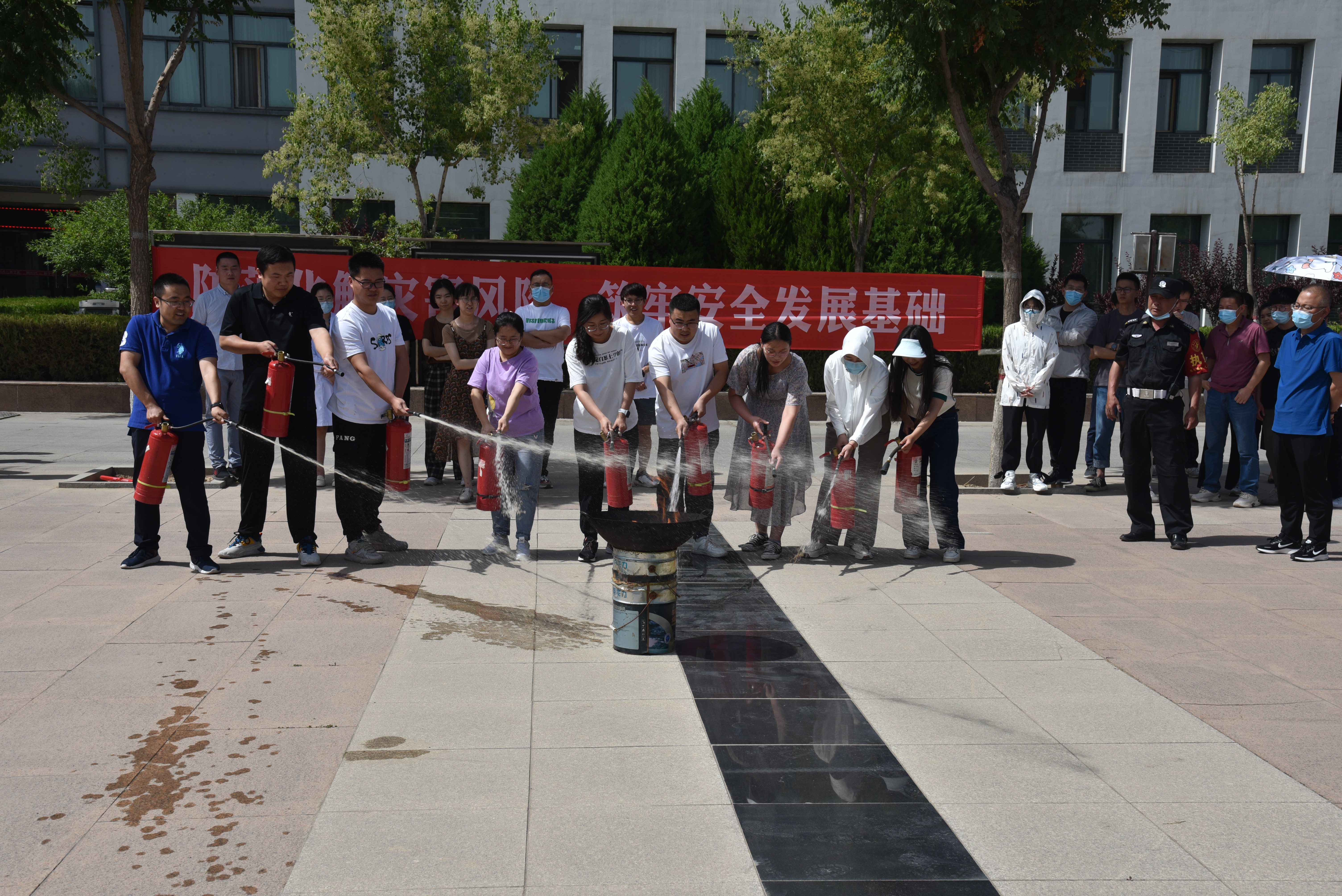 在全员撤离到安全地带后,学校保卫处和学校应急处置分队继续给全体师生演示灭火器、灭火毯等消防设备的使用方法,指导师生们进行了实际操作,切实提高了大家消防实战技能。