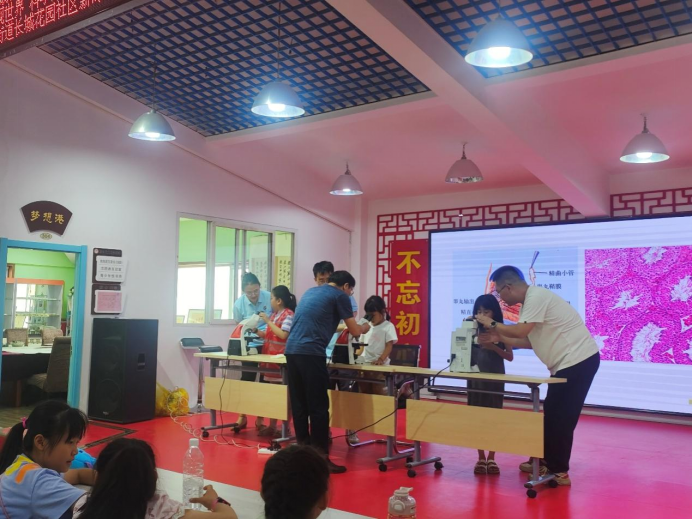师生给小朋友们科普显微镜下的细胞世界