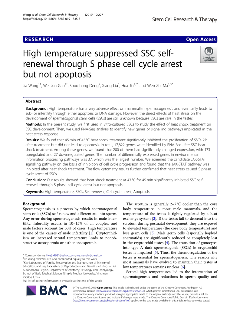 马文智-High temperature suppressed SSC self- renewal through S phase cell cycle arrest but not apoptosis