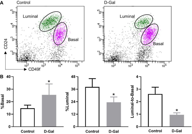 (B) Quantification of % basal cell, % luminal cell, and luminal-to-basal cell ratio in mammary epithelial cells isolated from control and D-galactose-treated mice (n = 5). Asterisks, significant difference between control and D-galactose (*P < .05).
