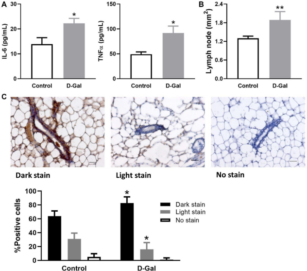 The mice treated with D-galactose exhibited significantly higher plasma levels of inflammatory cytokine IL-6 and TNFα than the control group (Figure 1A). Specifically, the levels of IL-6 and TNFα were increased 1.6- and 1.9-fold, respectively. Mammary glands from D-galactose-treated mice had enlarged lymph nodes, which on average increased approximately 1.45-fold when measured by area (Figure 1B). In addition, p-STAT5, a downstream regulator of IL-6 and TNFα, was detected at a higher frequency of