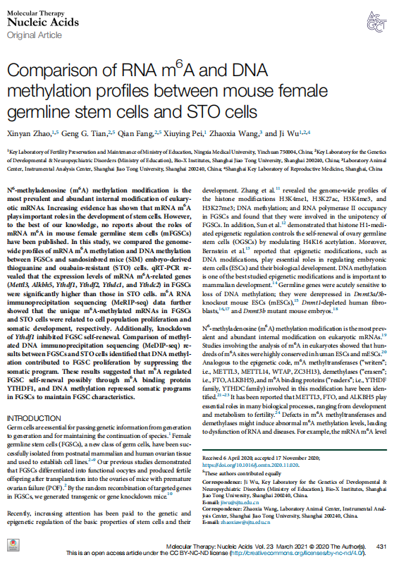 Comparison of RNA m6 A and DNA methylation profiles between mouse female germline stem cells and STO cells