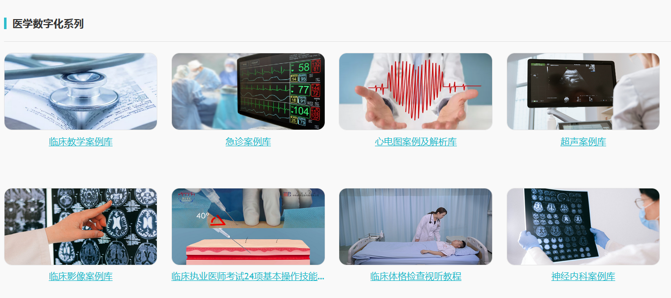 内容包括医学专著、教材、图谱、参考工具书、科普书的西医知识库,经典临床案例库,高清手术视频库,技能操作视频库,微课及案例式试题库等资源。