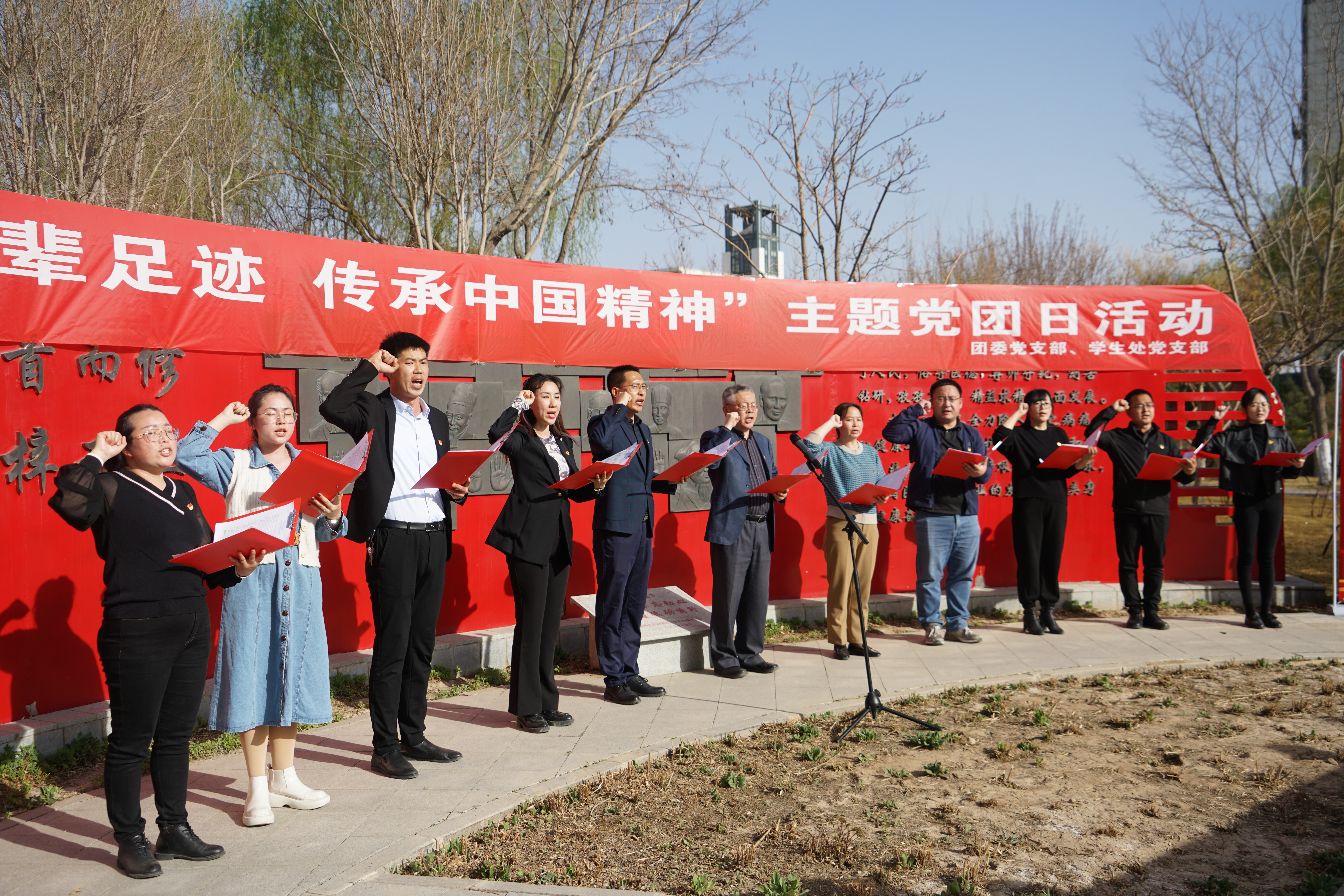 活动开始,全体人员默哀。默哀毕,师生代表通过分享革命先辈的丰功伟绩共同重温波澜壮阔的峥嵘岁月。首先,青年团员代表朗诵《红色家书》,他们从一封封红色家书中去铭记那段历史,“家书寄语,字短情长”,每个字、每句话都是那段红色革命洪流的历史见证,是一种为国家为民族牺牲自我、奋斗拼搏的人生诠释。 其次,辅导员代表朗诵《中国精神》,他们用民族精神激励着当下新时代青年,为祖国发展繁荣而不懈努力,为中华民族崛起而自强不息,最终实现中华民族伟大复兴的中国梦。最后,朱建华同志带领团委、学生处党支部全体党员朗诵《永不褪色的精神礼赞——献给新时代的中国共产党人》,他们以问和答的形式,阐述了共产党人要走好这一代人的长征路,并向柯小海、蒋富安、李桂芝等新时代中国共产党人看齐,把新时代奋斗者的奉献精神作为价值追求,坚定理想信念,强化责任担当,争做时代先锋,为新时代中国共产党人的历史使命砥砺前行,再次出发。