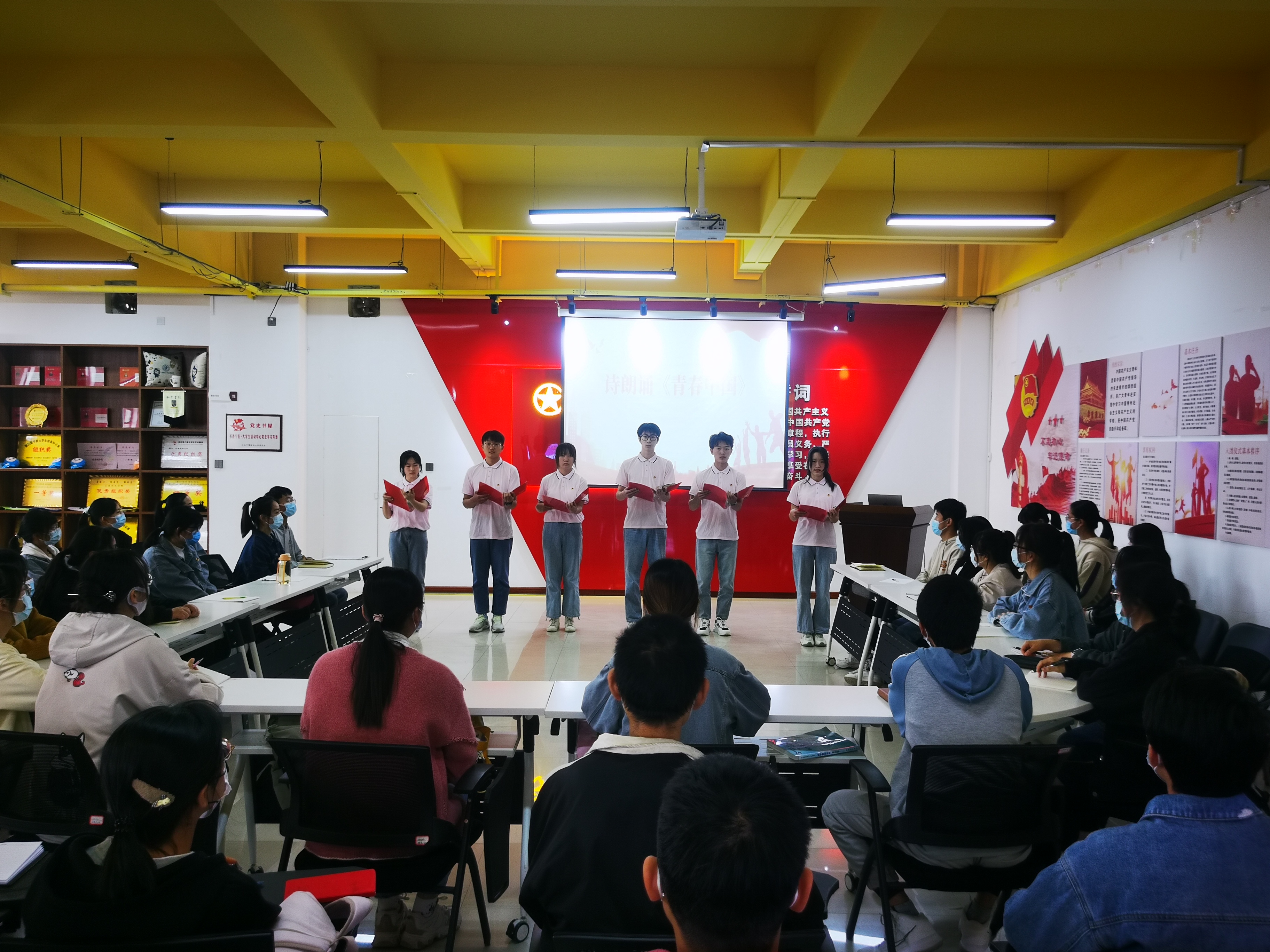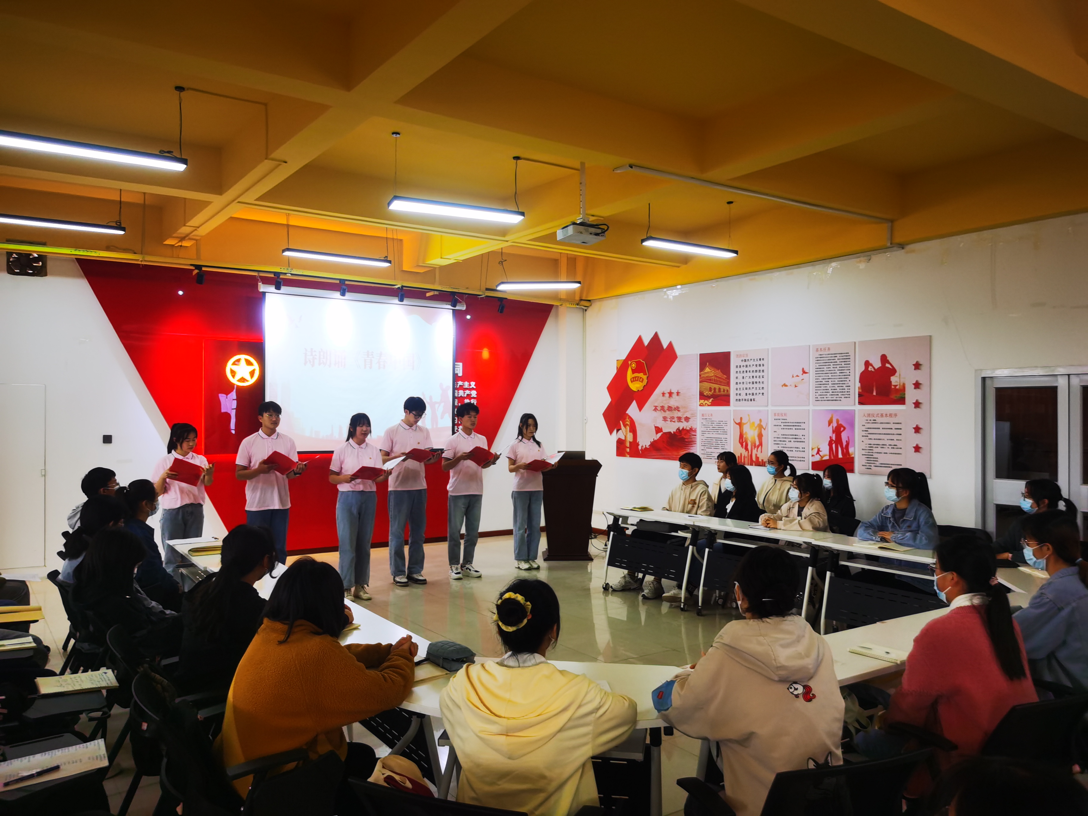主题团日活动在介绍《习近平与大学生朋友们》这本中拉开帷幕。团支书结合视频资料向大家介绍了这本书的整体框架、丰富内容,深入解读了本书受青年学子广泛推崇的内在原因。在交流发言环节,4位同学通过研读《习近平与大学生朋友们》具体篇章,结合自己在学习生活中的所见所闻,从“年轻人要‘自找苦吃’”、“要给书本上的知识‘挤挤水’、“立志要高、起步要低”等方面分享了自己的学习心得。诗朗诵《青春中国》将主题团日活动推到了高潮,同学们慷慨激昂、掷地有声地诵读,深切讴歌了正在崛起、正值青春的伟大中国,抒发了青年大学生对祖国对人民的无比热爱之情。