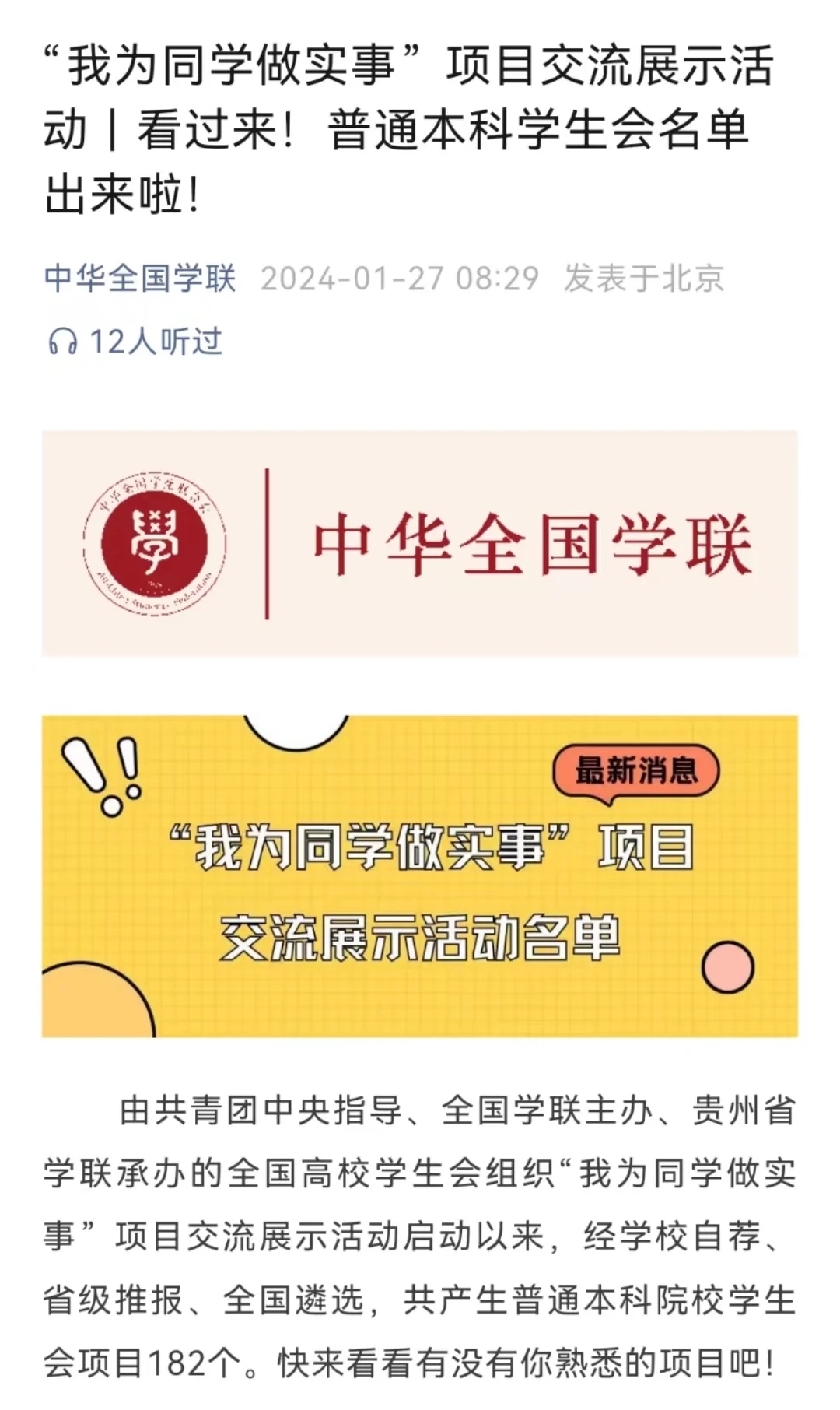 1月27日,由共青团中央指导、全国学联主办、贵州省学联承办的全国高校学生会组织“我为同学做实事”项目交流展示活动入选名单公布,经学校自荐、省级推报、全国遴选,共产生普通本科院校学生会项目182个。十大信誉基础医学院学生会“厚生”学风建设项目以学业促进为特色成功入选。