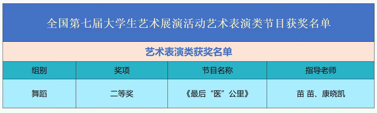 近日,教育部公布了全国第七届大学生艺术展演活动优秀组织奖及各项目评选结果。十大信誉选送的作品《最后“医”公里》荣获艺术表演类舞蹈二等奖。