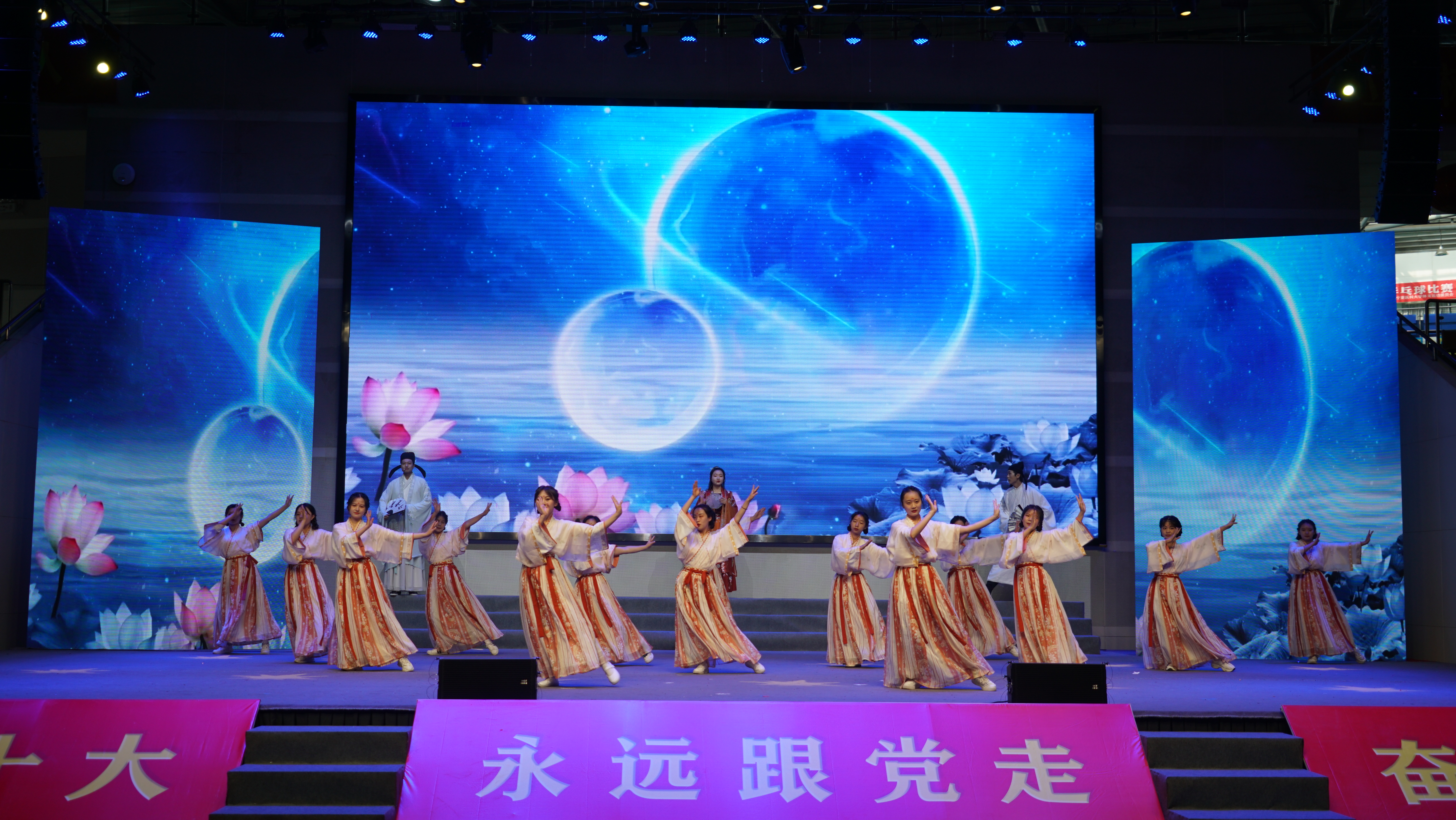 月光下舞动的少女,手执红色折扇,护理学院团委《春江花月夜》拉开诗会帷幕。中医学院团委《和歌以诗 大美中国》,表达了当代青年对祖国母亲最真挚的赞美。