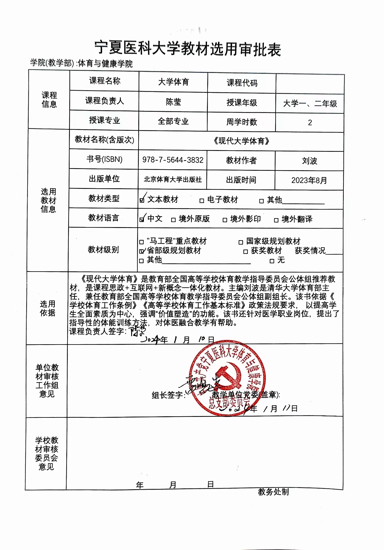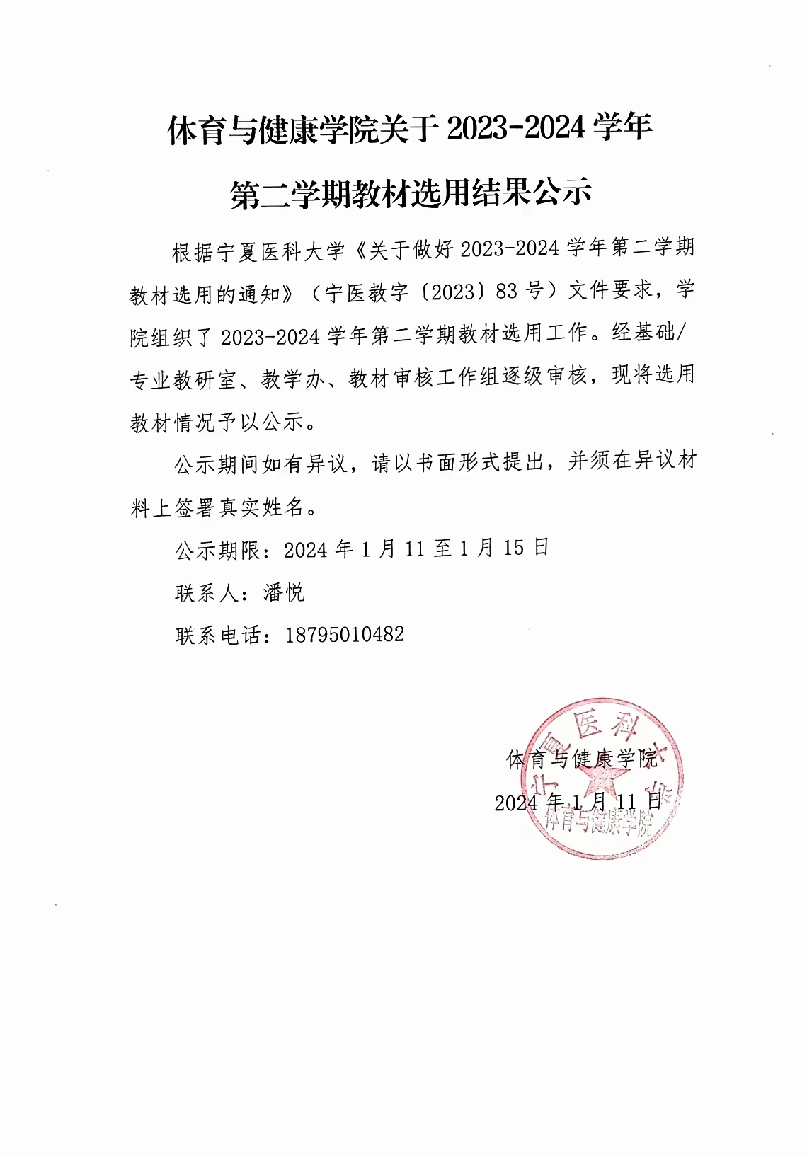 体育与健康学院关于2023-2024学年第二学期教材选用结果公示
