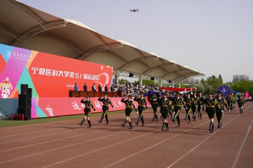 入场式上,伴随着雄壮激昂的运动员进行曲,国旗护卫队,校旗、校徽、彩旗队,各单位运动员代表方队依次入场,他们排着整齐的队伍,朝气蓬勃、昂首阔步、口号铿锵、意气风发地走在运动场上。在庄严的升国旗仪式中,全体师生员工肃立齐唱国歌,注视着五星红旗冉冉升起,每一道声音都是青春的宣言,汇聚着炽烈的力量。在方阵表演中,第一临床医学院学生带来的歌舞表演《青春至上》,以灵动的音符、曼妙的舞姿,彰显了宁医学子活力四射的青春之美;公共卫生学院学生在《青蓝之间》中演绎出生命旋律和运动之美;口腔医学院和检验学院学生在《石榴花开耀宁医》的欢乐乐曲中唱响各民族团结和谐之美,绘就出各民族像石榴籽一样紧紧抱在一起相亲相爱、团结进步的美好未来。