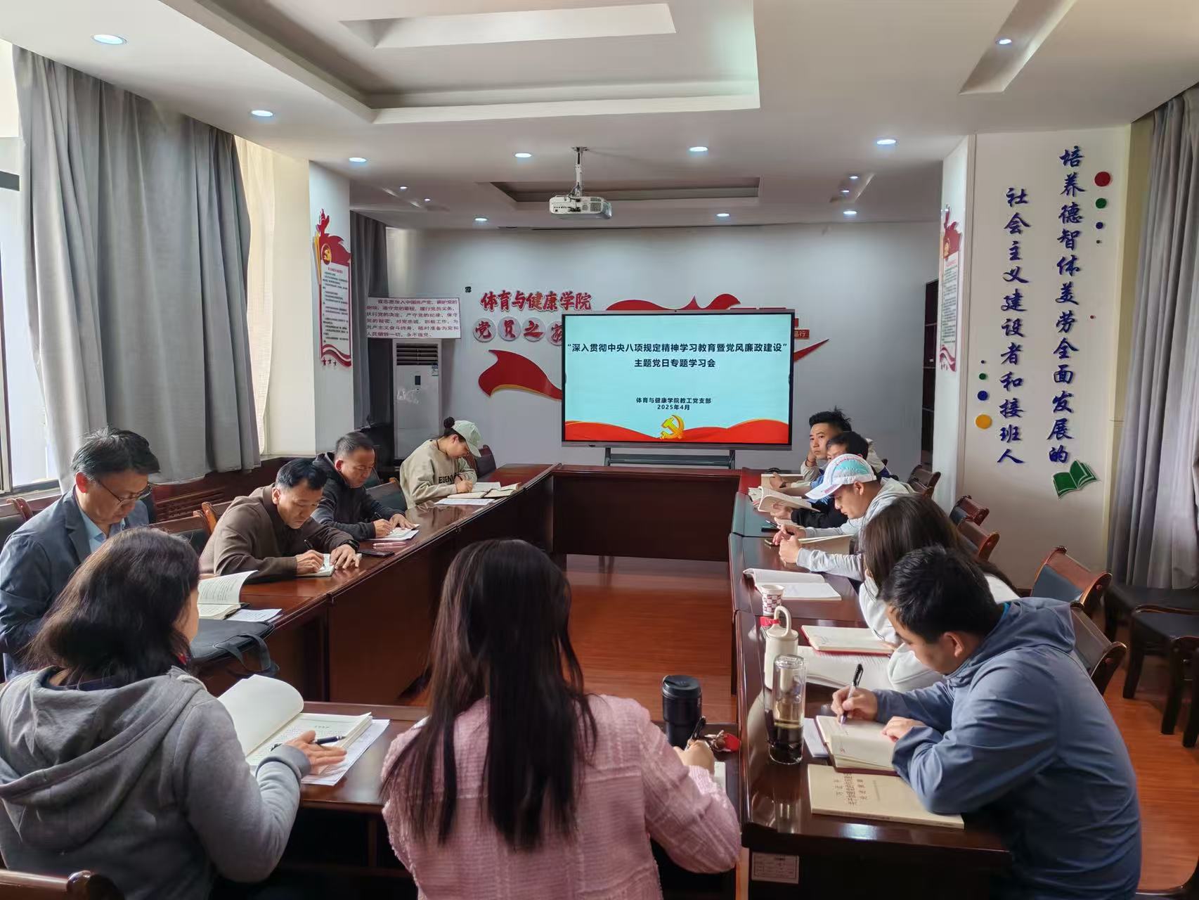 4月23日,体育与健康学院教工党支部在学院党员之家开展深入贯彻中央八项规定精神学习教育暨党风廉政建设主题党日活动。