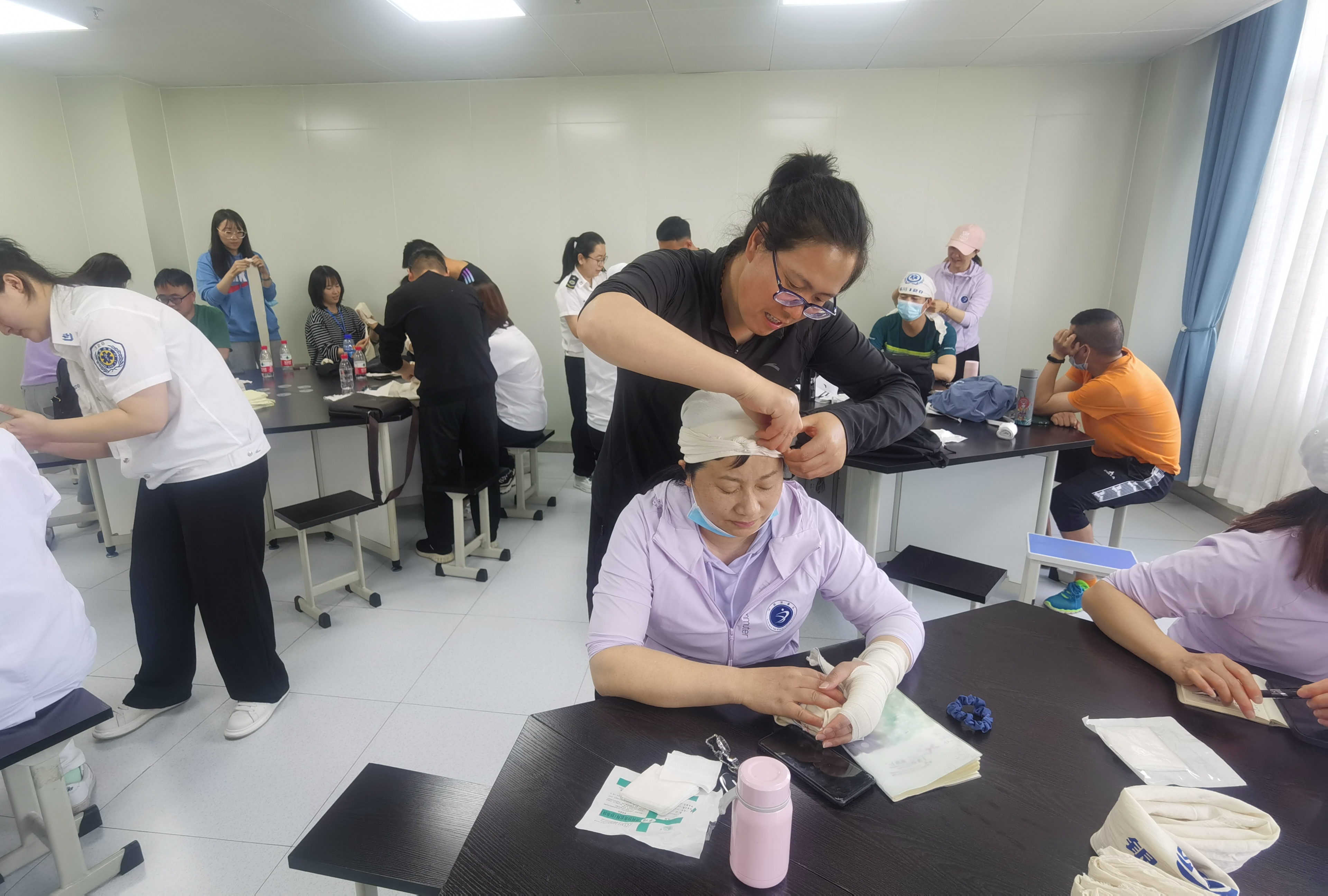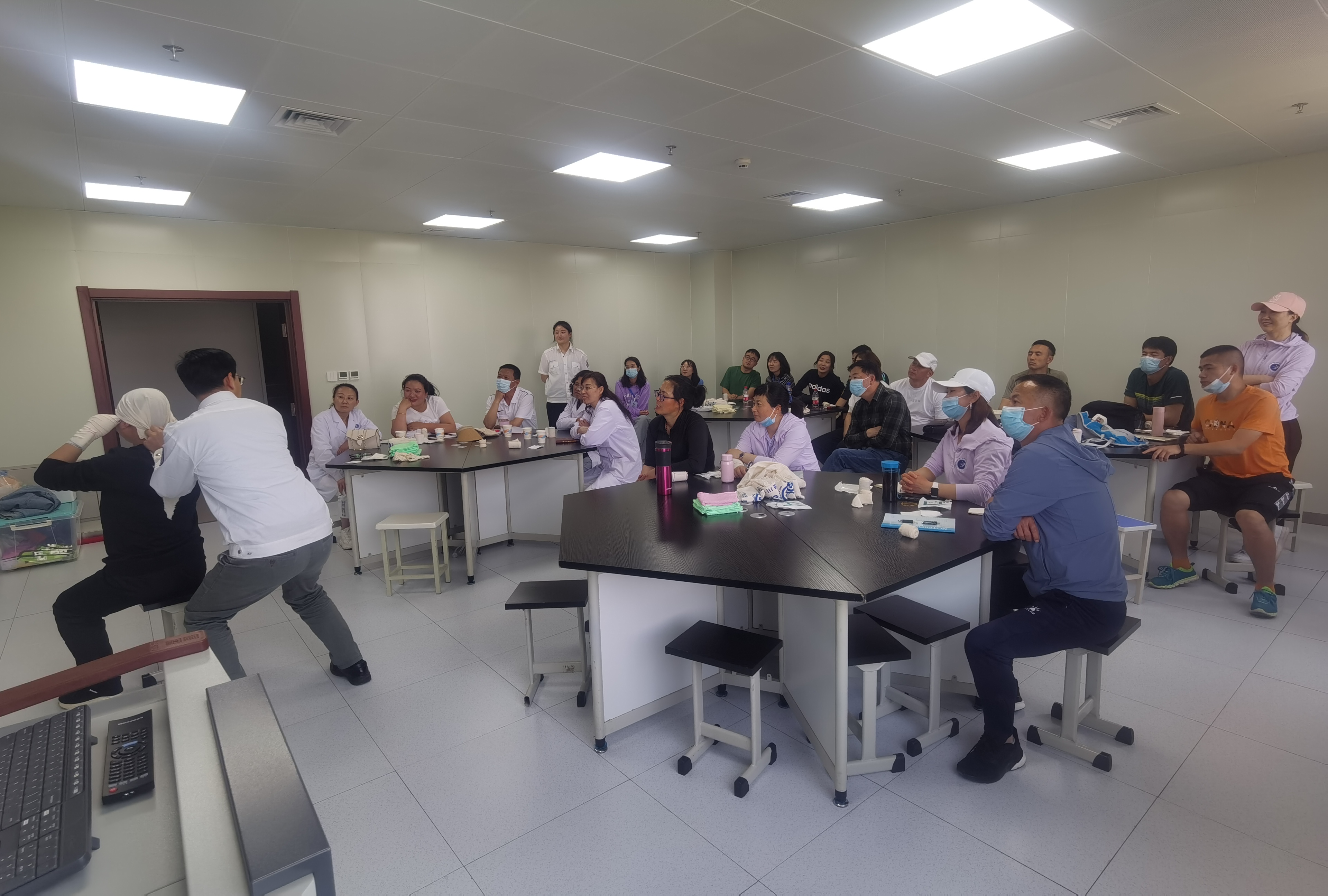 22名参训教师跟随120急救中心培训师共同学习了校园常见突发损伤情况、预防和处置措施等内容。10名教师全程参与学习了心肺复苏术、急救包扎等技能的实操训练。