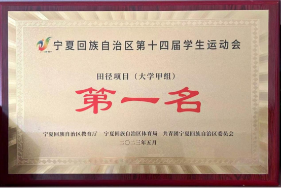 5月11日,学校田径队在宁夏回族自治区第十四届学生运动会中摘得个人、集体项目9金、4银、7铜,21人次挺进前八名,圆满完成了比赛任务。继自治区第十六届运动会取得优异成绩后,再次斩获大学甲组团体总分第一,并获“体育道德风尚奖”。