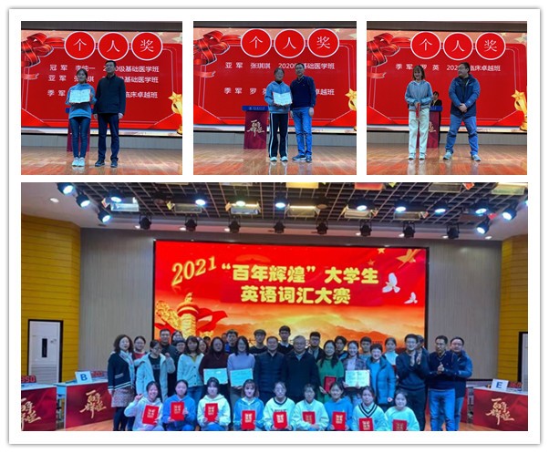 此次大赛融合了现场赛、云端赛与观众互动三种模式,不但为现场选手提供了展现英语能力的舞台,也为台下观众提供了彰显英语能力的机会。同时,大赛云端赛场为不能出席决赛的同学提供了平台弥补了遗憾。决赛在六支队伍响亮的口号声中拉开了帷幕。经过了五轮赛事的比拼,选手们从最初的互探虚实到后来的团队默契,睿智的表现和团队精神赢得满堂彩!台下观众时而捧腹大笑,时而拍案叫绝。台上妙语连珠,台下跃跃欲试,现场互动环节,台下观众的优异表现彰显了大国青年优秀的英语能力。此次大赛还请来2021全国大学生英语竞赛宁夏赛区特等奖获得者2018级口腔2班的沈淑奇与2021“外研社·国才杯”大学生英语挑战赛写作大赛宁夏赛区特等奖获得者2019级临床4班的谭泽群为赛场的选手与观众分享了自己的英语学习经验与成功背后的故事。最终,2021年词汇大赛在选手与观众们的欢声笑语中落下帷幕。李晔老师指导的2020级临床卓越班的肖茗中、陈泳甫、罗英摘得桂冠。赛后,学校及各部门领导为本次大赛获得团体奖的六支队伍、个人奖的冠、亚、季军与指导教师颁发了获奖证书。24名云端赛场的选手也因其优异的表现为自己赢得了荣誉与奖品。
