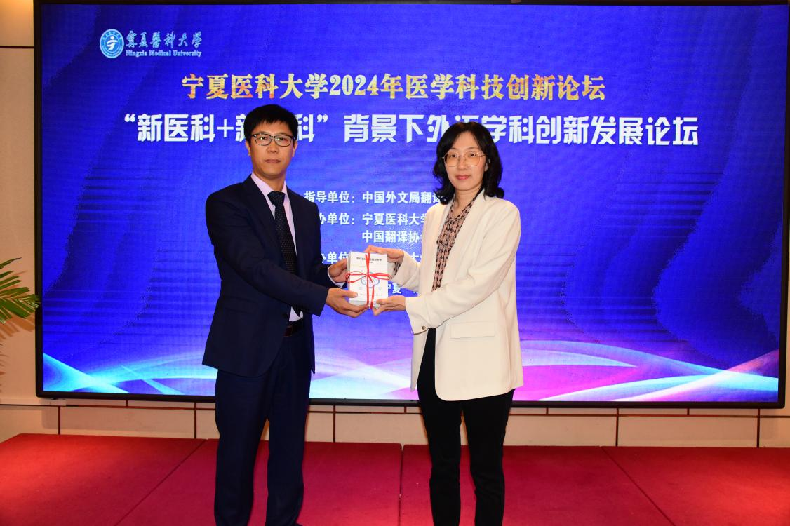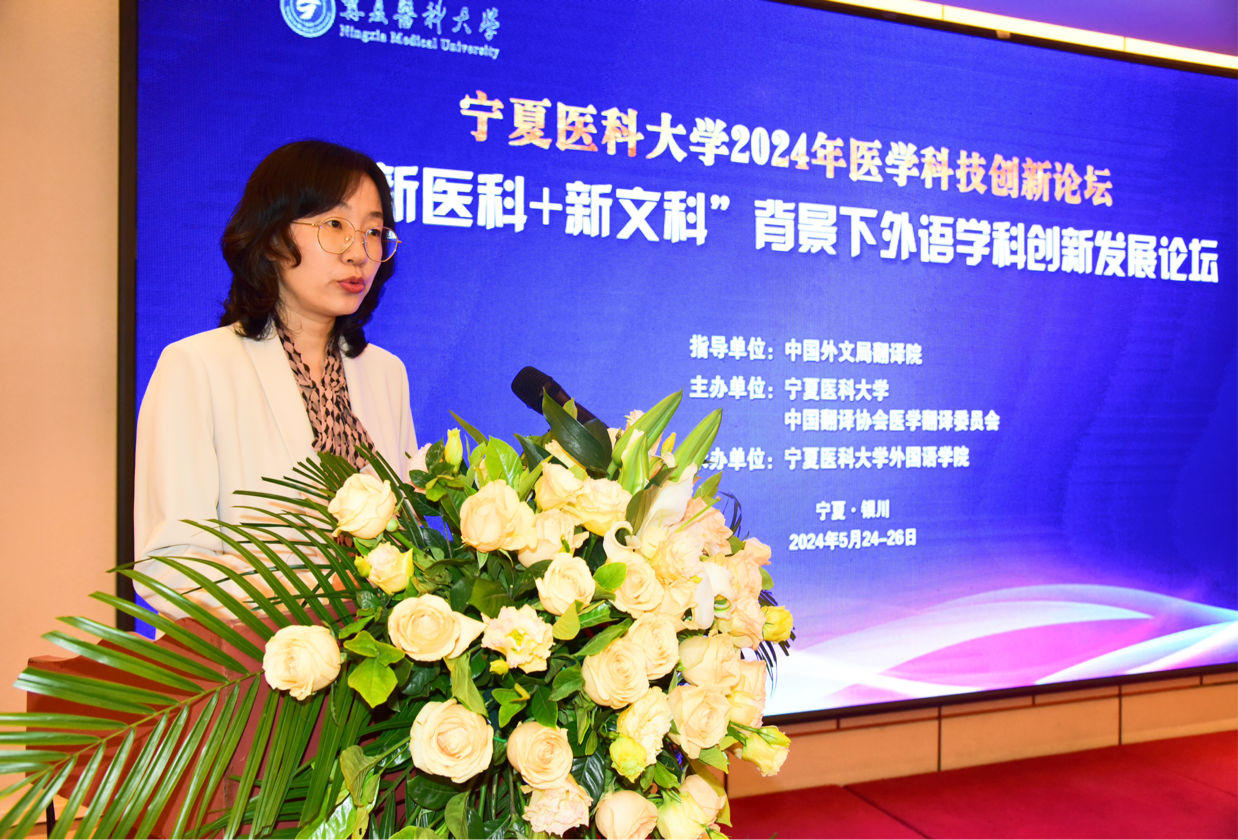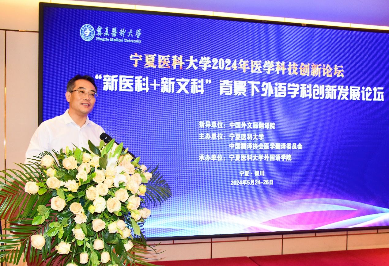 5月24日至26日,“新医科+新文科”背景下外语学科创新发展论坛在宁夏银川成功举办。本次论坛由中国外文局翻译院指导,澳门十大信誉好的网站和中国翻译协会医学翻译委员会主办,澳门十大信誉好的网站外国语学院承办。中国外文局翻译院副院长朱颖,澳门十大信誉好的网站党委常委、副校长史金龙,宁夏翻译协会副会长杨春泉出席论坛并在开幕式致辞。来自复旦大学、山东大学、河南大学、北京语言大学、广东外语外贸大学、北京第二外国语学院、首都医科大学、福建医科大学、新疆医科大学、湖南中医药大学和西安医学院等多所高校的专家、学者及澳门十大信誉好的网站80余名师生代表参加论坛。