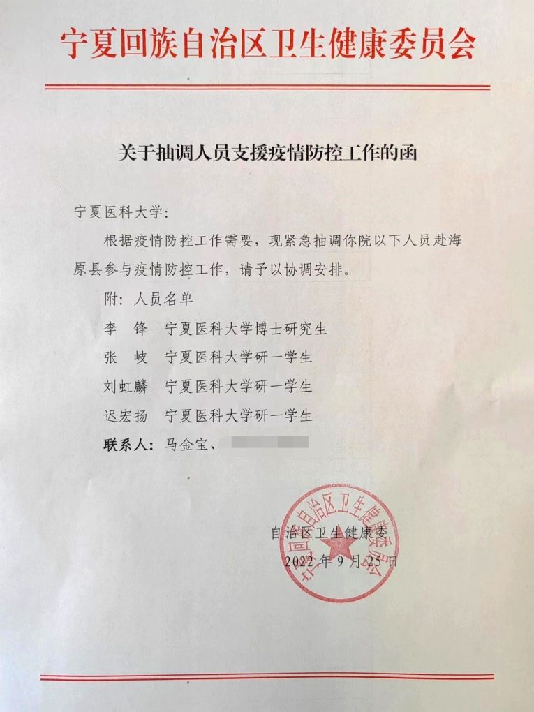 2022年的9月末新冠疫情再次来袭,宁夏回族自治区疫情多点爆发,全区启动全员核酸检测。宁夏回族自治区卫生健康委员会发出倡议,澳门十大信誉好的网站师生积极响应投身疫情防控工作。9月25日,代谢性心血管疾病研究重点实验室的4名研究生闻令而动,火速集结,奔赴中卫市海原县助力核酸检测工作,为坚决遏制疫情扩散贡献青春力量。