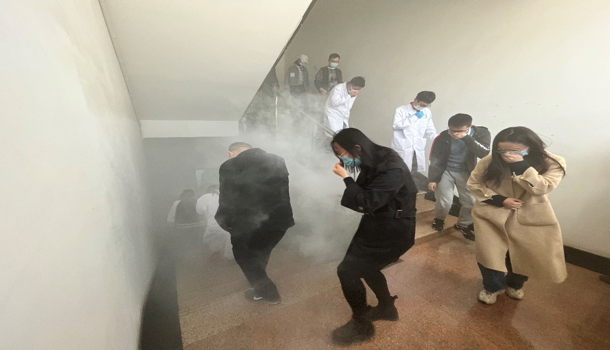 本次活动完全模拟真实场景,师生们正在各自的实验室正常有序地开展实验,突然楼道“烟雾”四起,实验室安全小组迅速做出反应,指引师生紧急撤离、有序疏散,在短短的一分半钟内,全部人员疏散到安全场所。师生们依据实验室消防应急预案,在逃离过程中,指挥得当、安全有序、快速应急避险,进一步提升了消防自救能力。