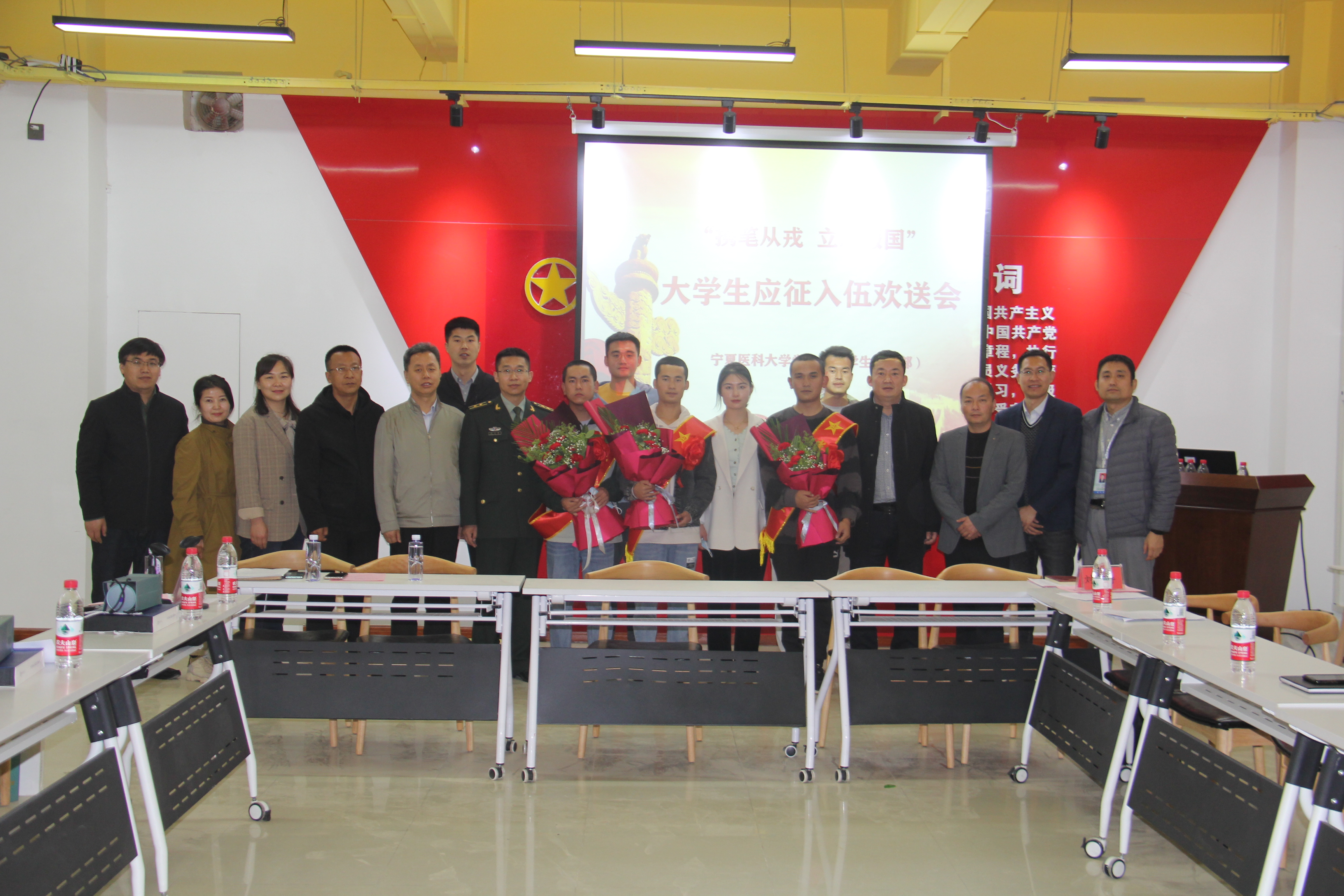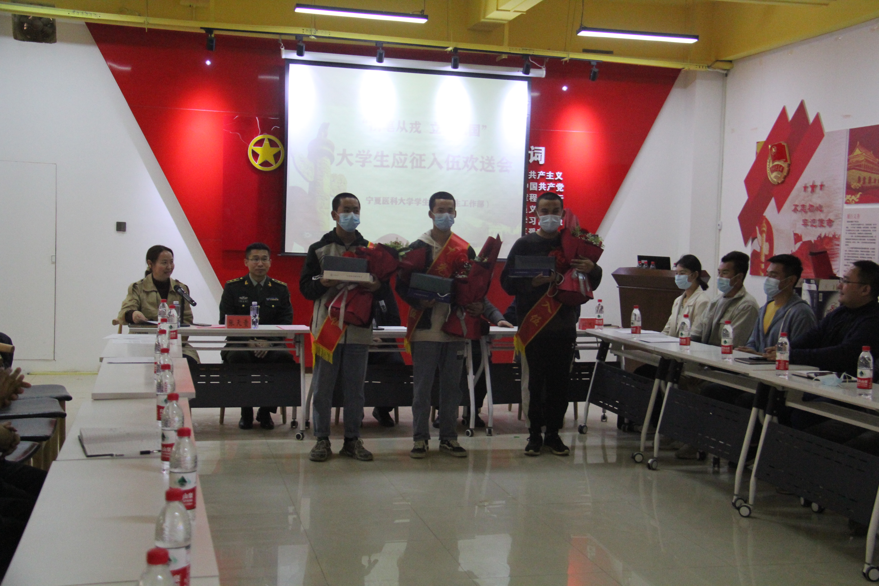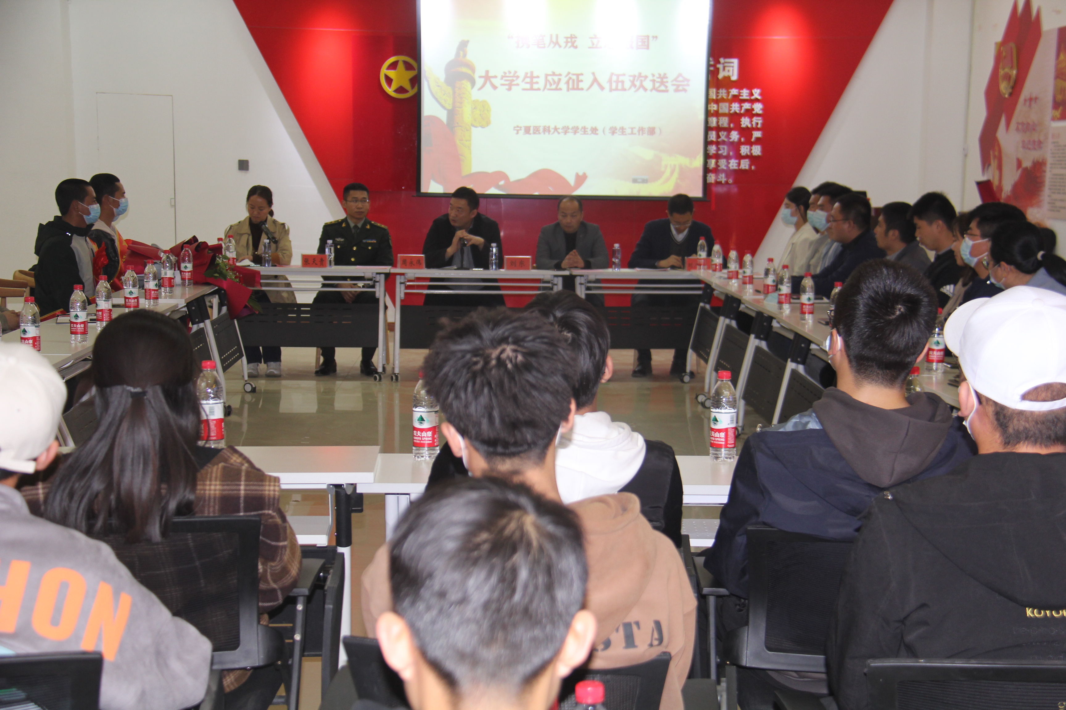 3月16日下午,“携笔从戎 立志报国”澳门十大信誉好的网站2021年春季应征入伍大学生欢送会于大学生活动中心举行,兴庆区武装部张天贵参谋,学校学生处(学生工作部)、招生就业处、团委负责人,相关学院分管学生工作副书记、学办主任、辅导员,新入伍学生、退役复学学生及普通学生代表共计60余人参加欢送会。会议由学生处(学生工作部)副处长李亚红主持。