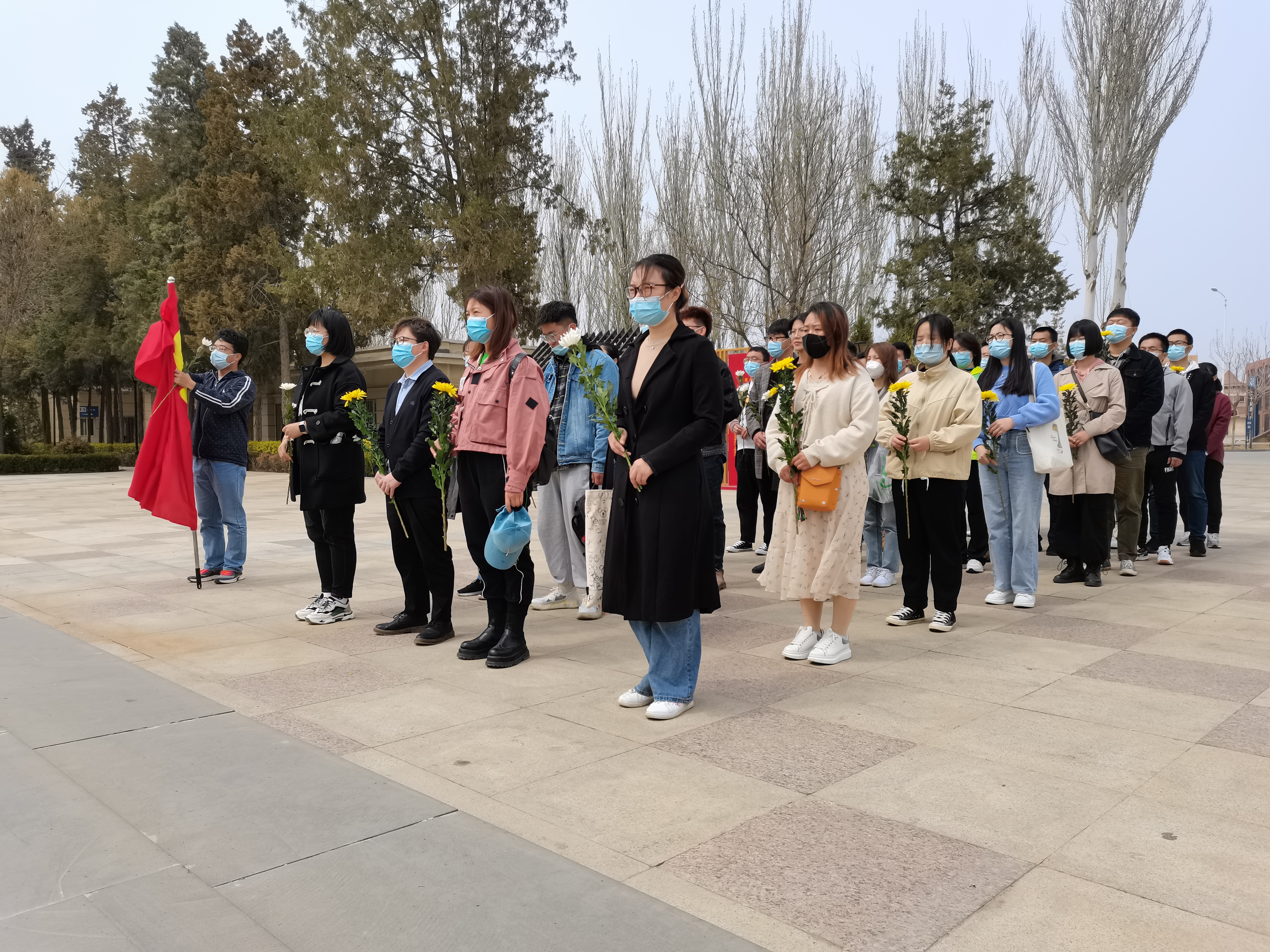 活动现场庄严肃穆同学们手持黄菊花在纪念碑前列队肃立,为中国人民解放事业和共和国建设事业英勇献身的烈士革命先烈默哀并有序向革命先烈献花,表达对革命先烈的崇敬和追思。