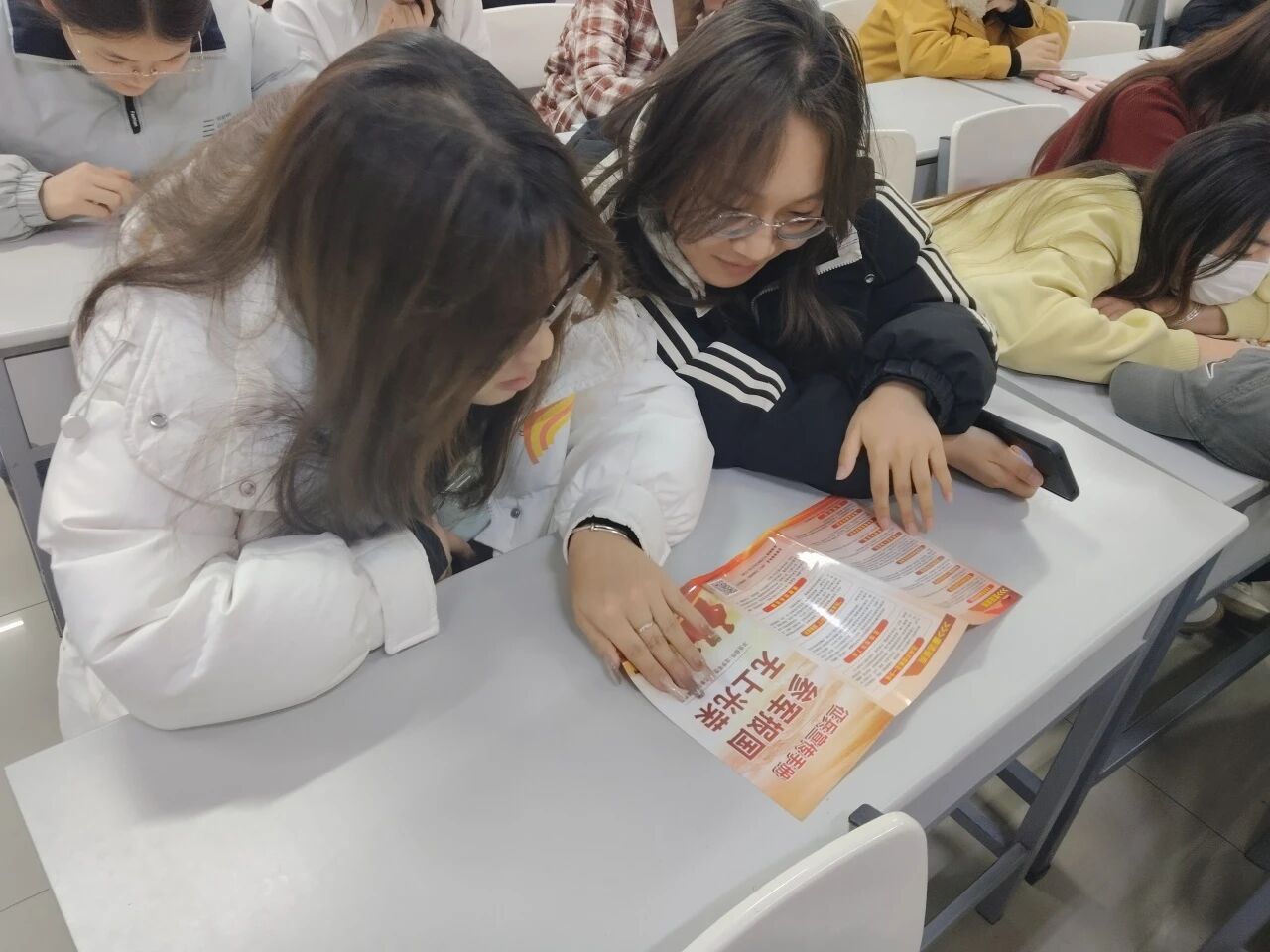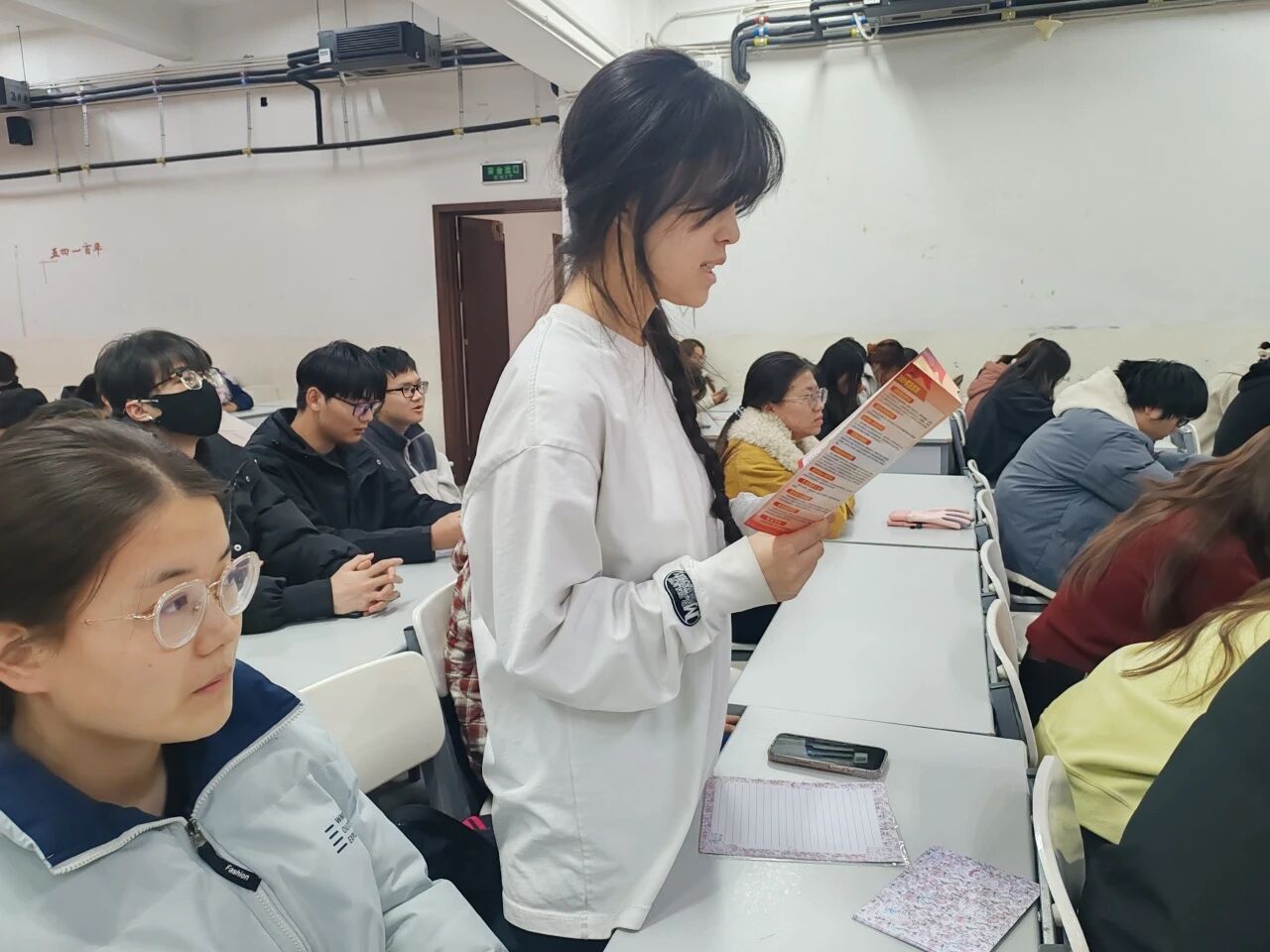 班会上,班长毛小梅结合最新征兵政策,围绕应征条件、报名流程、学业保留、就业优待、经济补助等内容进行宣讲。同学们认真聆听,并对照学校下发的征兵宣传材料展开交流讨论。