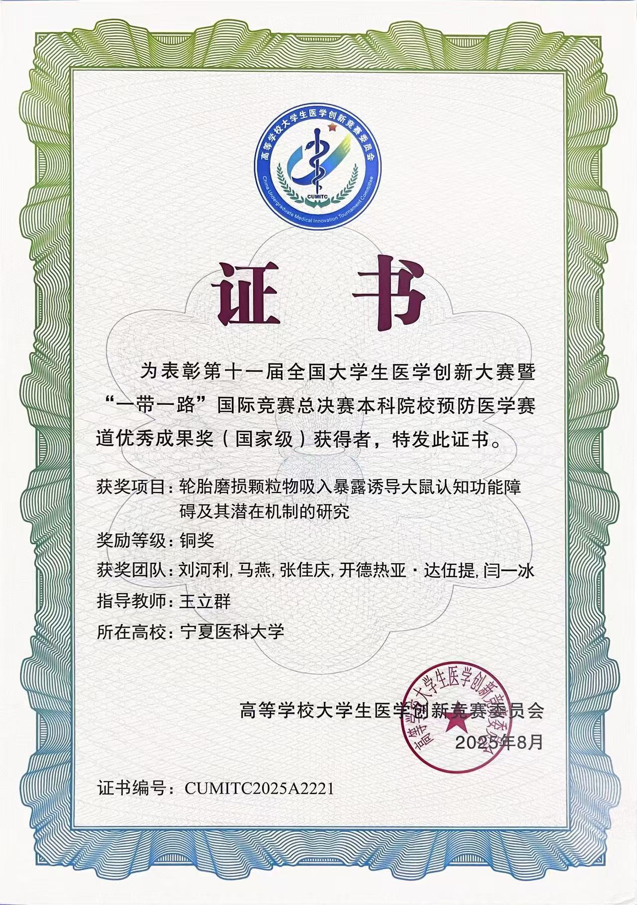 在学习上,我笃行求真、脚踏实地,27门必修课程均取得90分以上的优异成绩,2024-2025学年学习成绩与综合测评双双位居年级榜首。课堂上,我专心听讲,深入钻研专业理论知识,主动参与实验课程的实践环节,坚信勤奋付出终有回报,以积极乐观的心态迎接每一个学习挑战。课后,我主动拓展学术视野,积极参与各类学科竞赛,先后获得2024年第九届"复旦社杯"大学生学术英语词汇赛(本科及研究生组)三等奖、2025年第十一届全国大学生统计建模大赛区级三等奖。在科研方面,我作为项目负责人主导的课题"轮胎磨损颗粒物吸入暴露诱导大鼠认知功能障碍及其潜在机制的研究",在2025年第十一届全国大学生创新大赛暨一带一路国际竞赛中斩获国家级铜奖。