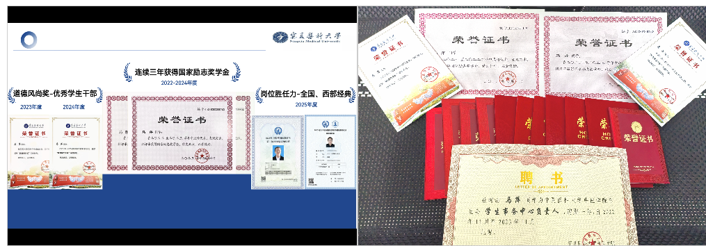 在学习上,我始终以严谨务实的态度对待学习。在课堂与课后的时光里,不断深耕专业知识,力求在学术与实践的结合中实现成长。这份坚持让我在学业成绩中一直名列前茅。在2024-2025学年中,我的智育成绩为62.96分,综测成绩为97.76分,均排名专业第一。目前已连续三年获得国家励志奖学金,连续两年获得“优秀学生干部”荣誉称号,“优秀共青团干部”、“优秀共青团员”、“道德风尚奖”荣誉称号,已通过2025年中医师岗位胜任力考试,全国中医经典等级一级考试,西部中医经典等级三级考试,澳门十大信誉好的网站第十六期青年马克思主义培训班成员。目前已成功推免至本校。