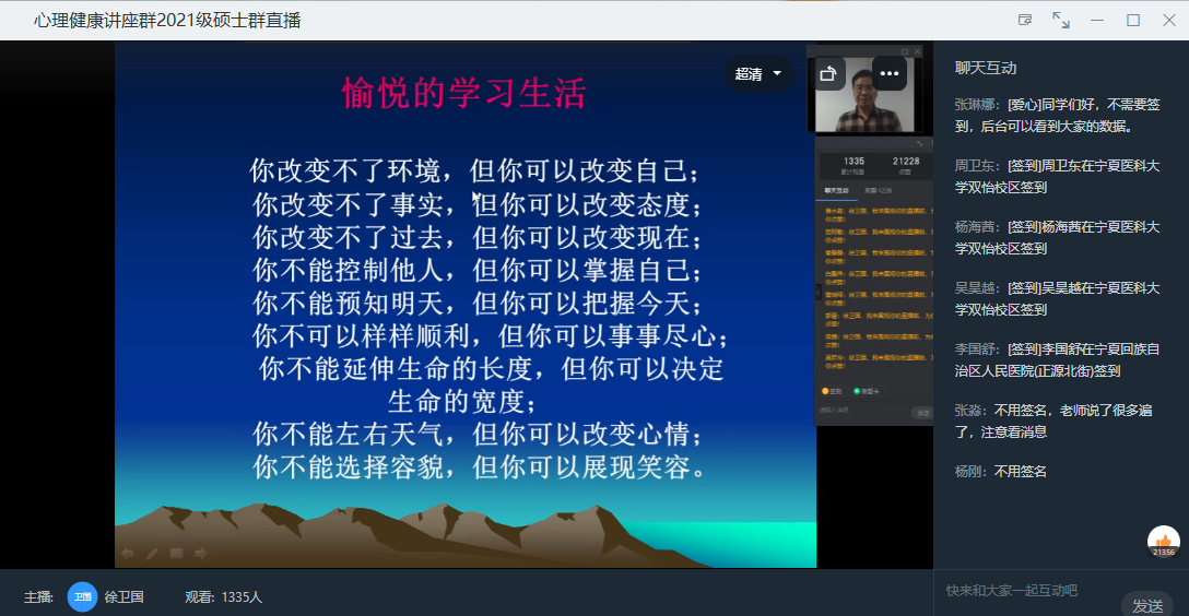 11月12日上午和晚上,宁夏精神卫生中心精神科主任医师徐卫国以题“有效应对学业压力,健康生活每一天”在线上分别向博士和硕士做了专题讲座。徐主任对校园生活中常见的心理健康问题进行深入浅出的讲解,帮助同学们理解心理健康的内涵,教会同学们正确看待事物、科学管理情绪、积极锻炼意志、培养良好人格品质、有效预防心理问题