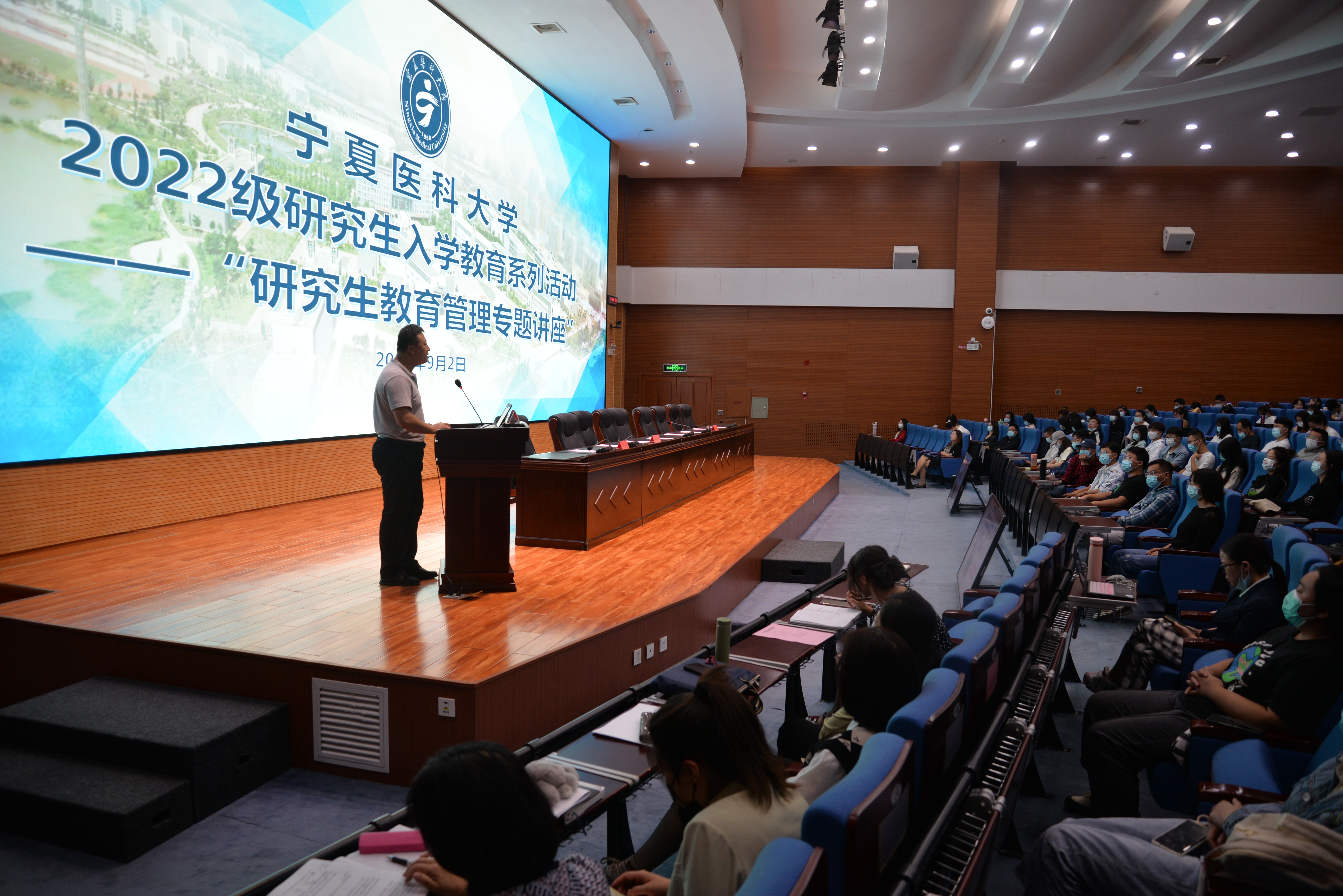 今年的研究生入学教育系列活动共分三个层面。第一个层面是由学校党委副书记、校长姜怡邓做“开学第一课”授课。姜校长以“不负重托 勇担使命 为我国卫生健康事业贡献青春力量”为题,为研究生传达了自治区第十三次党代会精神,带领大家深刻理解将于今年10月16日召开的党的二十大的重大历史意义,领会了新时代对研究生教育发展的要求,介绍了学校在教书育人及科学研究方面取得的成绩。姜校长结合自己职业生涯成长经历,分享自身的工作感悟,对研究生新生未来几年的学习、工作进行了宏观指导。他指出,研究生教育肩负着高层次人才培养和创新创造的重要使命,是国家发展、社会进步的重要基石,研究生新生要重点从理想信念、家国情怀、学术道德、创新能力、身心素质、人文素养等六个方面提升自己,才能成为一名优秀的研究生,练就过硬本领,以出色的成绩完成学业。