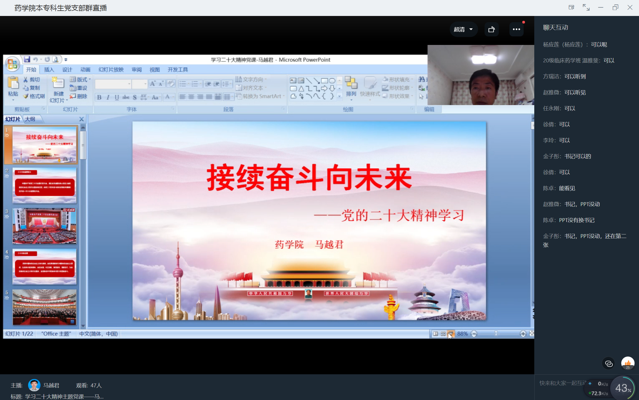 11月27日下午,药学院本专科生党支部开展“学习宣传二十大精神 争做新时代优秀党员”主题党日活动,学院党委副书记马越君为大家讲授党课。