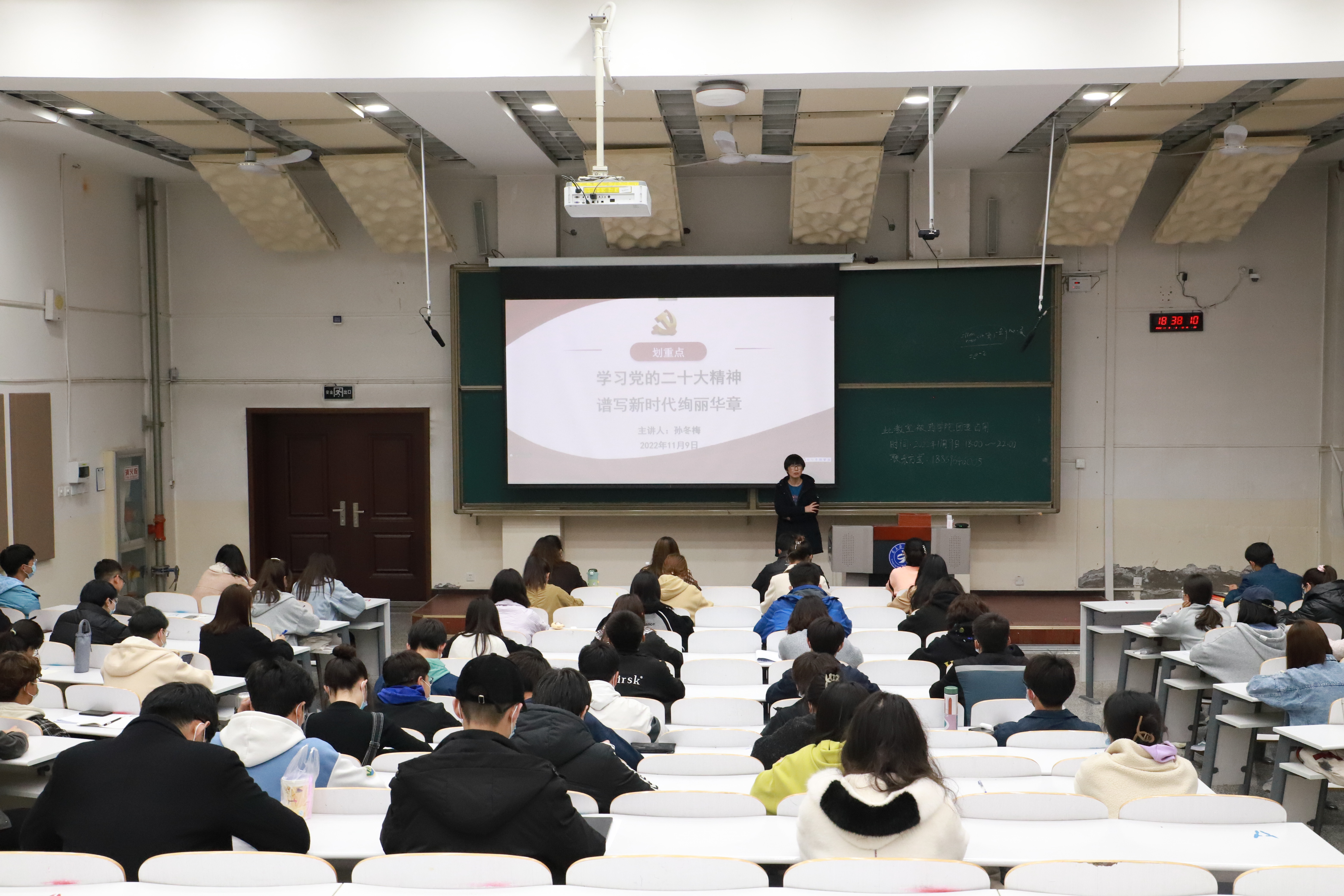 11月9日下午,药学院党委书记孙冬梅在应谦楼106教室以“学习党的二十大精神,谱写新时代绚丽华章”为题讲授专题党课。药学院全体学生党员及入党积极分子通过线上线下相结合的方式进行学习。