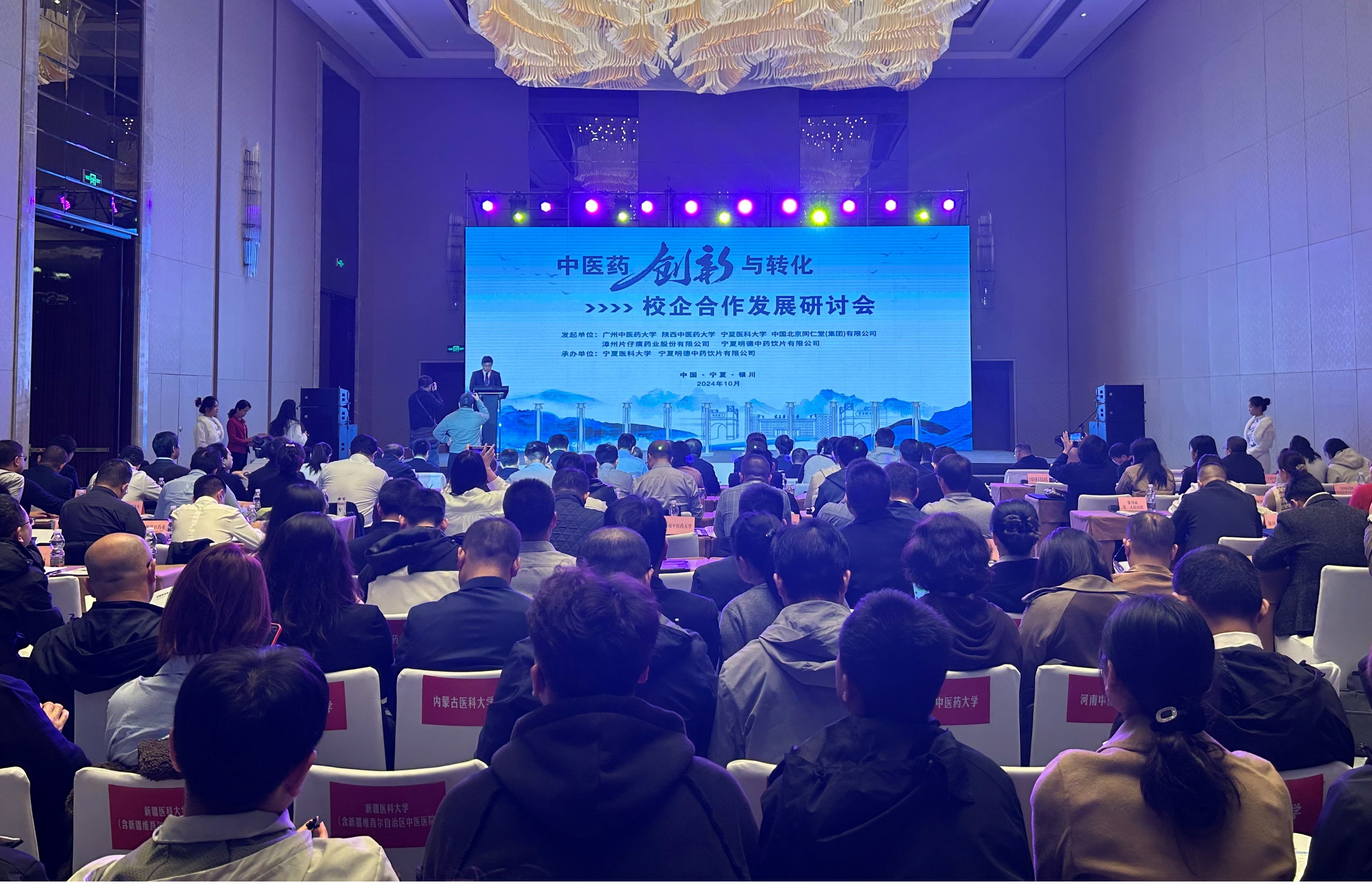 10月26日,由广州中医药大学、陕西中医药大学、澳门十大信誉好的网站、中国北京同仁堂(集团)有限公司、漳州片仔癀药业股份有限公司、宁夏明德中药饮片有限公司联合发起,澳门十大信誉好的网站、宁夏明德中药饮片有限公司承办的中医药创新与转化——校企合作发展研讨会在银川顺利召开。自治区政协主席陈雍出席开幕式。自治区科学技术厅副厅长桑长清,学校党委副书记、校长姜怡邓,学校党委常委、副校长刘志宏,全国各地近50家高校和药企相关负责人参加会议。