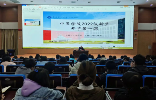 11月11日,中医学院在尚行会议中心开展以“学习宣传党的二十大精神,推进中医药传承创新发展”为主题的新生入学教育系列活动,学院院长朱向东为2022级新生讲授开学第一课。